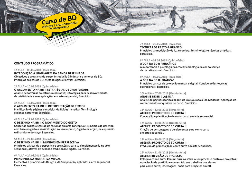 The 3rd Montijo Comics Course: Initiation to Sequential Art, held in partnership with the municipality, enters the final stretch this week with the Creative Wrokshop module.The last two months have been stimulating and somewhat exhausting, as the additional content instilled in this training has required further study and preparation, but the effort has been offset by the students, who have responded to the challenge with commitment! Between absolute newcomers of fifteen years old and others more seasoned participants who have come to refresh their knowledge, there are potential future values for the comics community here, and it has been equally gratifying to see the progress of less-experienced students in the field.